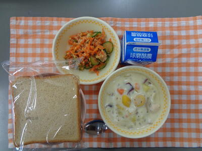 献立:黒糖パン、くりいもシチュー、キャロットサラダ、牛乳