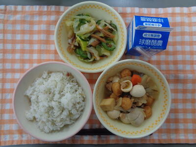 献立:梅ちりご飯、おでん、寒づけ和え、牛乳