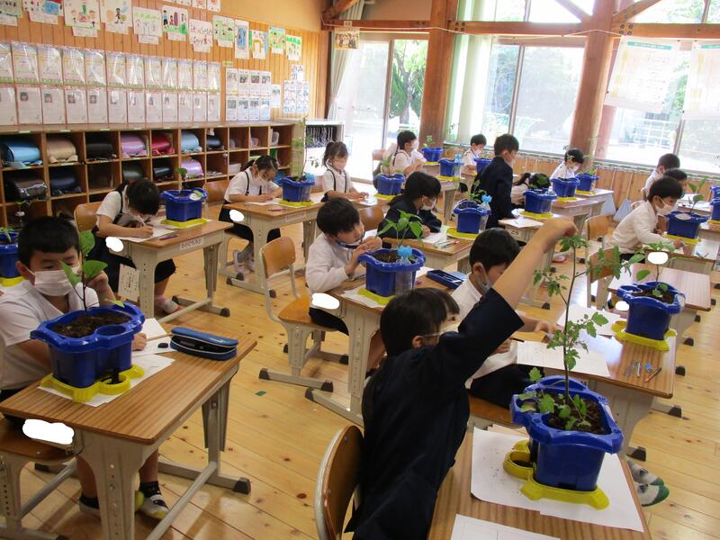 生活科の時間に学級園と自分の鉢に野菜を植えました。学級園には、ミニトマト・ピーマン・オクラ・トウモロコシ・キュウリを植え、当番が水をかけて世話をしています。鉢には自分が育てたい野菜を植え、国語の学習と併せて成長を観察しています。今日は、机の上に鉢を持ってきて五感を使って観察し、観察メモを書きました。「ちっちゃいトマトがなってるよ。」「ナスのはっぱがふわふわしてる。」など、たくさんんの気づきが出されました。これからも、おいしくいただけるようになるまで、世話や観察を頑張っていきます。