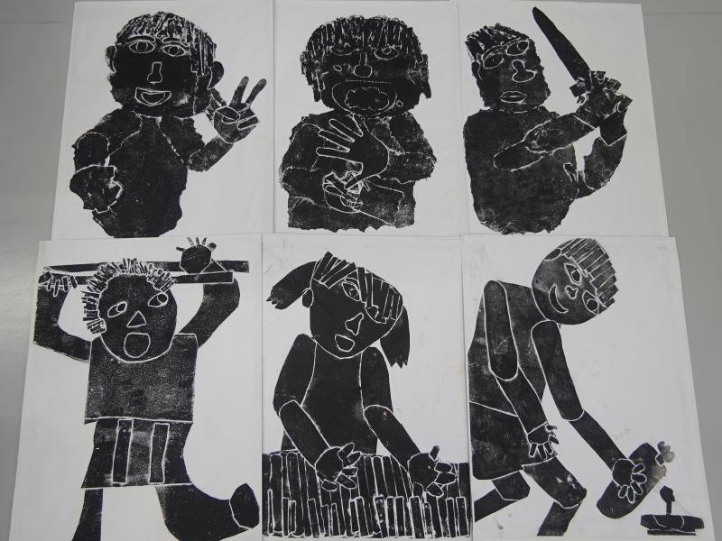 図工の時間、紙版画に取り組んでいた1年生。完成作品が増えてきました。
