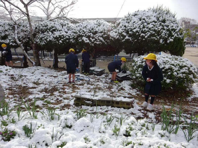 昨日18日(木)の朝は雪が積もっていました。元気いっぱいの1年生は、雪の中を元気に登校しました。