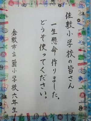 以前にも多くの支援をいただいた学校です。4年生の時に豪雨災害を経験した薗小学校6年生が、卒業式を前に心を込めて作ってくれた物です。相手を思いやる気持ちを私たちも忘れずにいたいものです。