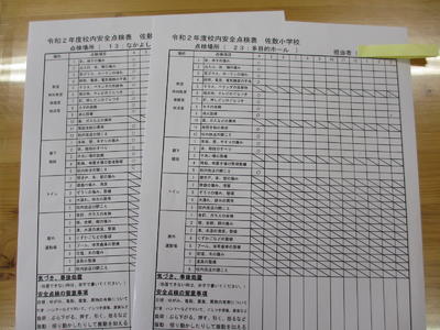 点検表にチェックをしながら、不備な点はないかどうかを確認しています。子ども達の安心・安全のために、目を光らせて取り組んでいます。危険箇所については、職員で補修したり、業者に修繕を依頼したりして早急に対応しています。