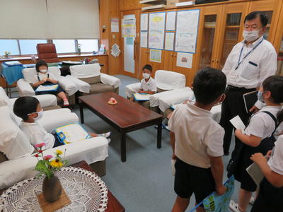 今日は特別にお客様用のソファに座らせていただき、校長先生に質問をしていた子どもたち。おもてなしのために校長室にお花が飾られていることも知りました。また、ふかふかのソファに座ってお客様の気持ちになり、とても嬉しそうでした。