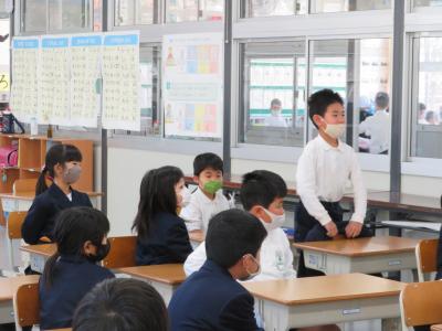 校長先生のお話に続いて、各学年代表の児童発表となりました。どの発表にも、次の学年への進級・進学を意識した目標があり、新たな年の始まりを予感させる素晴らしい出来映えでした。