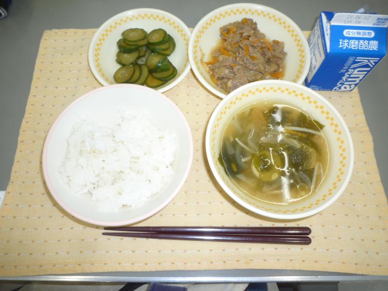 今日の献立は、 牛乳・ぷちまるごはん・わかめスープ・きゅうりのピリ辛・焼肉 でした。