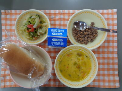 献立:コッペパン、かぼちゃポタージュ、イタリアンサラダ、チョコタッフィー