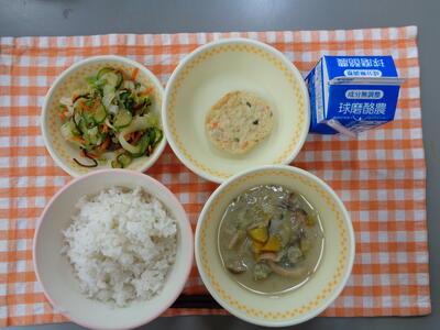 献立:むぎごはん、わかめ汁、こんさい信田、ちりめんあえ、牛乳