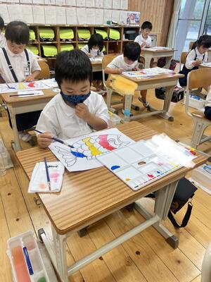 図工の学習で1年生は、初めて絵の具を使って