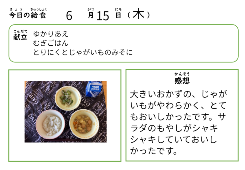 15日(木)の6年生の給食の様子です。メニューは、牛乳、むぎごはん、ゆかりあえ、鶏肉とじゃがいもの味噌煮でした。6年生は、残菜を出さないように工夫して、おいしそうに給食を食べていました。いつもおいしい給食ありがとうございます。