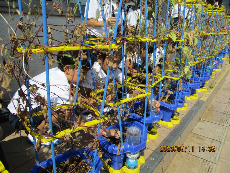 1学期に種を植えた「アサガオ」。夏休み中は家に持ち帰って水かけをしたり花の数を数えたりしました。今は葉っぱが枯れたり種ができたりしていますが、まだまだ変化を続ける「アサガオ」に子ども達は、驚きと感動をもって接しています。
