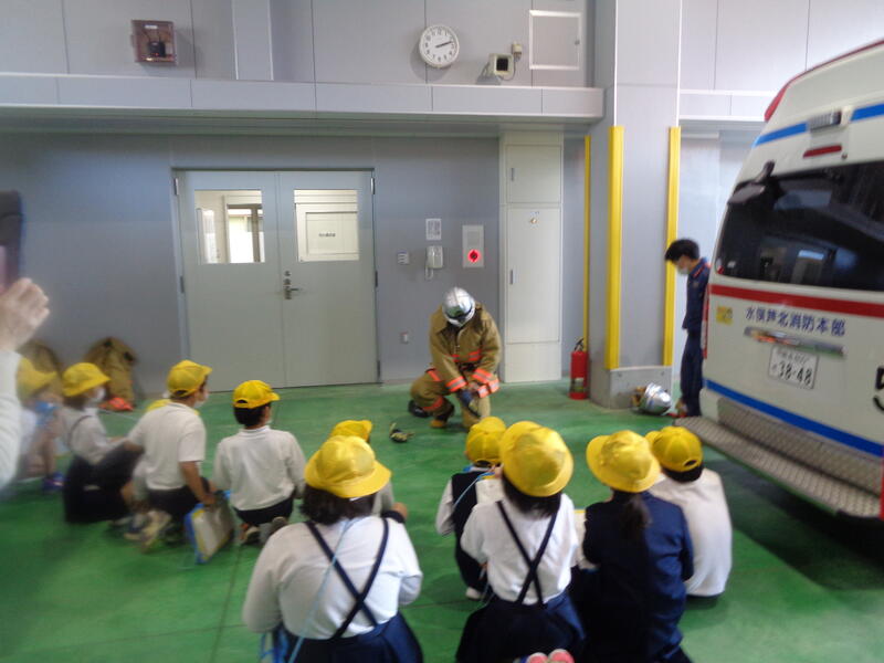 消防署の施設、消防車や救急車等を見学し、訓練の様子を見たり消防服を着る体験をしたりしました。