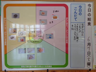 献立:むぎごはん、ごもく汁、さかなのこうじ焼き、手作りふりかけ、牛乳