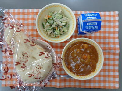 献立:ナン、チキンカレー、カミカミサラダ、牛乳