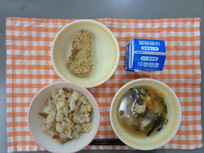 献立:むぎごはん、わかめ汁、こんさい信田、ちりめんあえ、牛乳