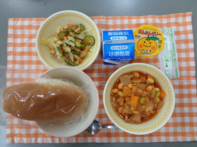 献立:コッペパン、ポークビーンズ、カシューナッツサラダ、ばんかんゼリー、牛乳