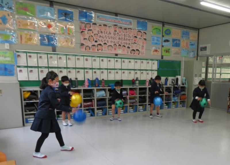 「あんたがたどこさ」の歌に合わせて、「さ」のタイミングで片足上げてボールをくぐらせたり、左右にとんで「さ」の時だけ前にとんだりしました。