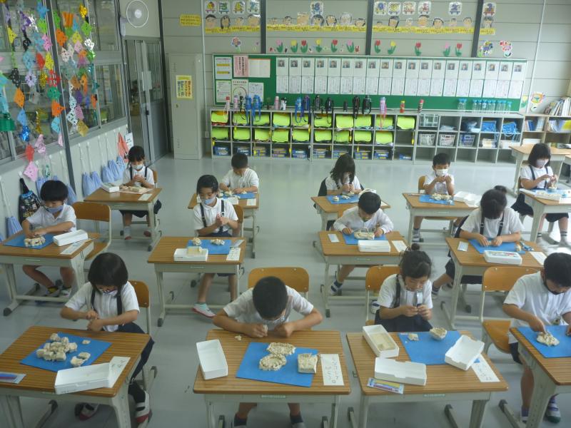 図工の「ねんどとなかよし」では粘土を触って楽しみました。「気持ちいい~」と言いながら楽しそうに粘土をこねていました。これからの雨の季節、休み時間に粘土を楽しむ児童も増えそうです。