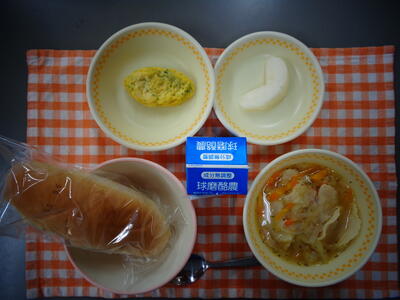献立:コッペパン、ラビオリスープ、ほうれんそうオムレツ、なし、牛乳