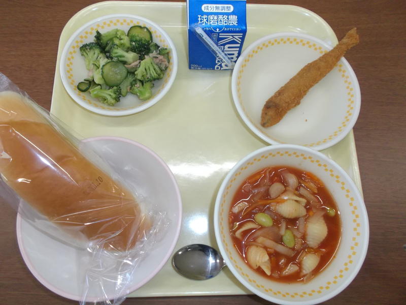 今日の給食のメニューは、ミルクパン、ミネストローネ、ブロッコリーサラダ、ししゃもフライ、牛乳でした。