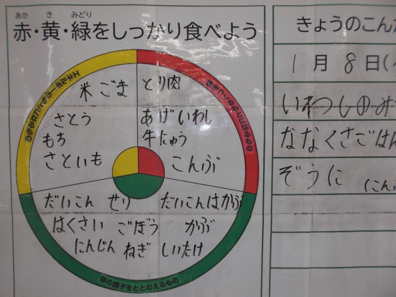 ご存知のとおり、日本では古くから野草の七草を入れた作ったおかゆを正月7日に食べる習慣があります。今日の給食では、七草がゆを給食風にアレンジした「七草ごはん」が登場しました。大根、大根の葉、かぶ、かぶの葉、せりなどが入っていました。コロナ禍にあり、水害を経験しただけに、今日は「無病息災」を願っていただきました。