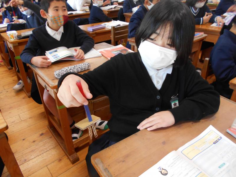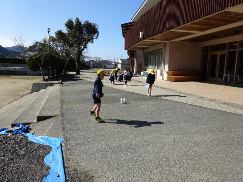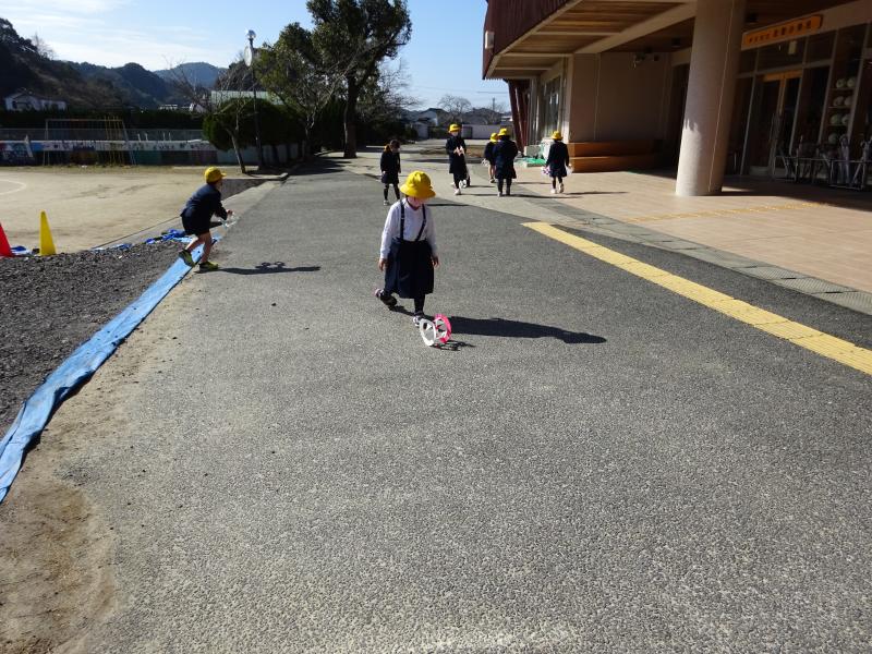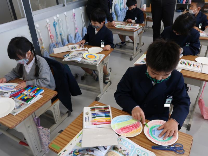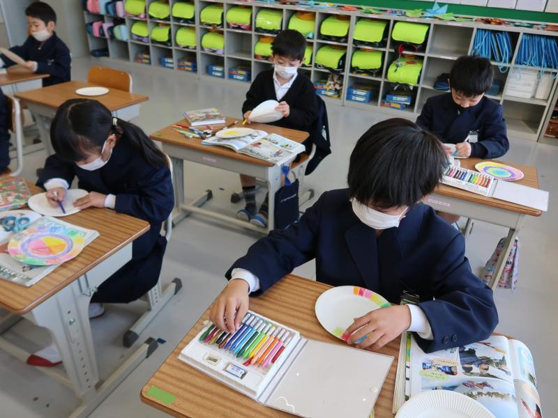 生活「ふゆをたのしもう」の学習では、紙皿を使って風で転がる輪を作りました。紙皿を自分の好きな色でいっぱいにした子ども達。外にでて風で転がしたときは、とても鮮やかに見えました。冬の風を感じながら、一生懸命追いかけていました。