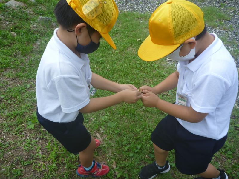 バッタやカニを捕まえて観察したり、オオバコのつなひきをしたりと、楽しく活動しました。学級園では、ミニトマト、パプリカ、キュウリなどを植えて育てています。1年1組が畑で育てたキュウリがやっと1本収穫できました。