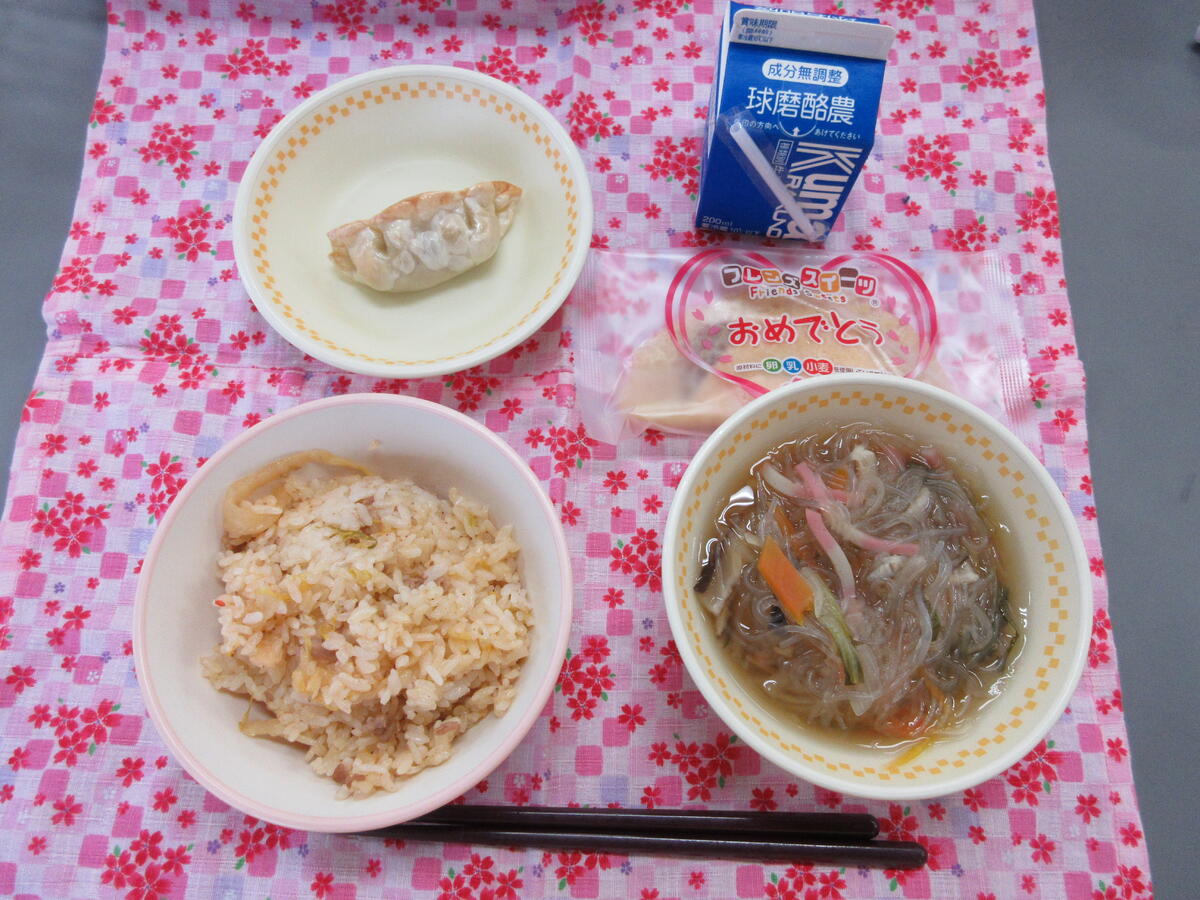 今日の給食の献立は、ぶたキムチごはん、春雨スープ、ぎょうざ、牛乳、お祝いデザートでした。