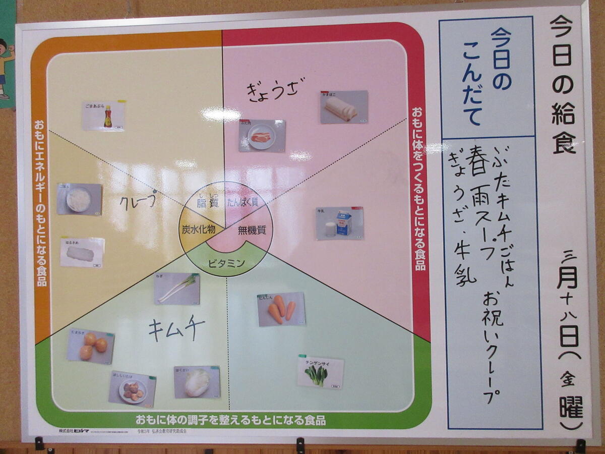 今日の給食は、人気メニューの豚キムチご飯です。キムチに含まれる乳酸菌には、腸内の善玉菌によって腸内の環境を整える効果があります。また豚肉にはビタミンB1が豊富に含まれており、体内で糖質をエネルギーへと変えてくれる働きがあります。今日は、小学校に卒業お祝いクレープがつきました。小学校6年生のみなさん、おめでとうございます。