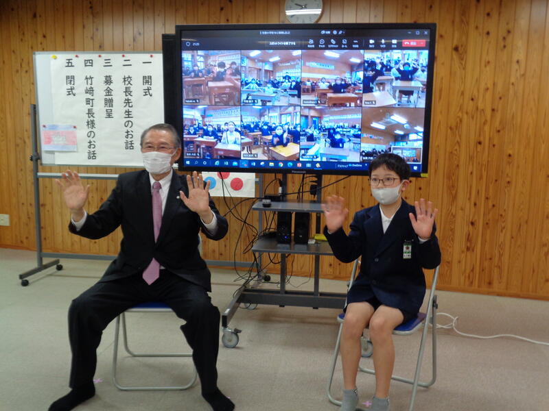 例年は地域の方にもたくさんおいでいただき「チャリティーバザー」を行うのですが、コロナ禍でそれはできません。企画委員会を中心に考え、今年度は募金活動を行いました。その益金(97,345円)の贈呈式を行い、竹﨑町長様も参加くださいました。リモートでしたが、最後には全員で手を振り、笑顔で終えました。