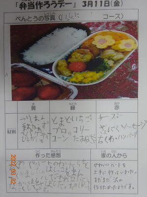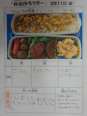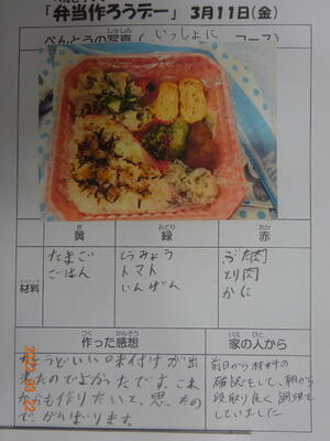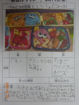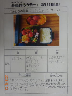 今年度2回目の「弁当作ろうデー」でした。早起きして作った子どもたちも多かったようです。これからも食べることを大切にして生活して欲しいと思います。ご協力頂いたおうちの方には大変お世話になりました。ありがとうございました。