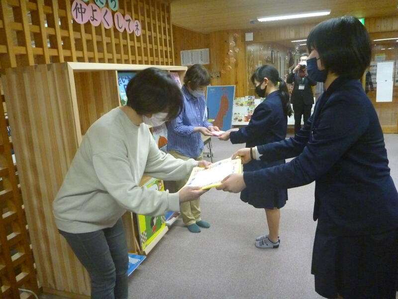 令和3年度は、新型コロナウイルス感染予防のため、読み聞かせができない月もありましたが、毎月2回ずつの、「本の読み聞かせ」を子ども達はとても楽しみにしていました。一年間の感謝を込めて、「青い鳥」の代表の方々に図書委員会から、手作りの「感謝状」をお渡ししました。PTAから大型読み聞かせ絵本も新しく購入頂いたので、新年度の「読み聞かせ」を楽しみにしています。