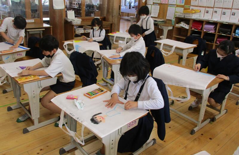 今日は、図工で描いた作品をまとめて入れる作品バッグに絵を描きました。「楽しいですね」「家でも描いていいですか?」と言いながら、自分の描きたいものをびのびと楽しそうに描く子どもたち。出来上がったバッグには、1年間描き溜めた力作を入れて持ち帰りました。2年生でのこの頑張りは、それぞれの子どもたちの宝物となるでしょう。