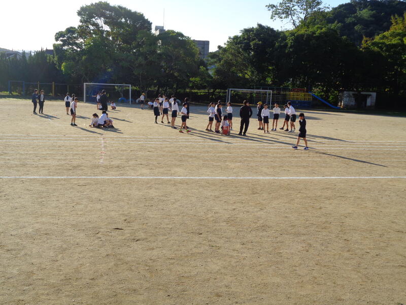 前日練習の様子です。5,6年生で運動場でリレーの練習をしています。