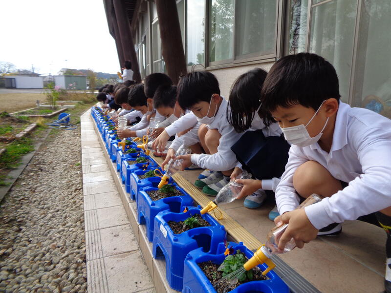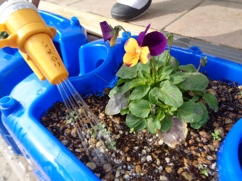 卒業式の会場に飾ることができるように、1年生全員で一人一鉢ずつビオラの花を育てています。11月の初めに植え付けたころはまだとても小さい苗でしたが、「大きくなってね。」と声をかけ水をかけて世話をしていたら、かわいらしい花が咲き始めました。「わたしのビオラにつぼみがあるよ。」と、葉と葉の間に隠れているつぼみを見つけては歓声を上げています。3月までにはもっと大きく生長するようにこれからもお世話を頑張ります。