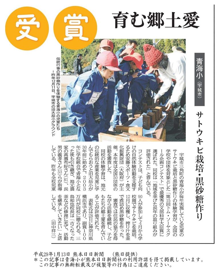 平成28年 「ふるさとを愛し、豊かな心を育む体験活動 ~ サトウキビ栽培から黒砂糖作りまでの全過程の取組を通して~」 が日清食品安藤財団「第15回トム・ソーヤースクール企画コンテスト」にて、学校部門の最優秀賞となる「文部科学大臣賞」を受賞。(九州では初の受賞)ここでは、1~6年生までの全校児童が 参加し、郷土愛を育む教育効果の高い活動であった点や、保護者や地域住民も参加し、地域を挙げて学校教育を応援しようという姿勢に支えられて、30年間続く伝統的な活動に発展している点が評価された。