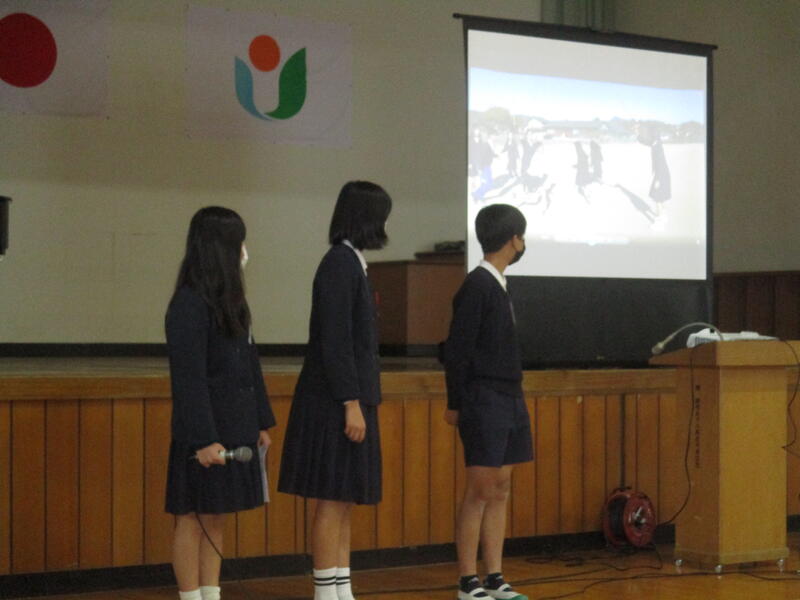 1月13日(火)の業間で、今年初の「のびっこ集会」を実施しました。今月の生活目標は「きもちのよいあいさつをしよう」です。どの学級も、「相手の目を見て気持ちのよいあいさつをする」ことを目標にしてくれましたが、いざとなるとなかなか難しいもの。それでも生きていく中ではとても重要なことです。お互いに気持ちのよいあいさつができるよう様子を見守っていきたいと思います。また、保健体育委員会からは、動画を使って長縄大会に向けてのポイントアドバイスがされました。「どうすればたくさん跳べるか」を5つのポイントで説明してくれました。なかなかよくできていましたよ。また、企画運営委員会からは、書き損じはがき集めの事前告知がなされました。よろしければ、ぜひご協力をお願いします。