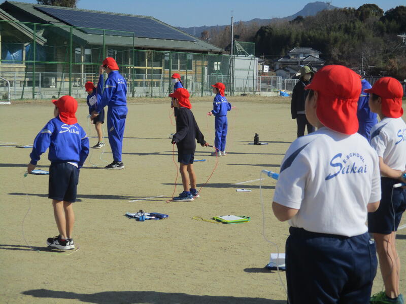 2月3日(火)の3時間目、体育の時間や業間、休み時間等で頑張ってきた成果が試される「縄跳び大会」を実施しました。低学年・中学年・高学年それぞれに、前とび、後ろとび、あやとび、交差とび、二段とび、かけあしとびなど様々な課題があり、児童一人ひとりが自分の目標達成に向けてチャレンジしてきました。当日は30秒インターバルで、前に挙げた様々な種目をとび、数をカウントしていきました。ペアで数を数え合い、記録をしていきます。最後に、感想交流の時間がありましたが、「〇級になったので嬉しい」などの発表がありました。天気は快晴で、子供たちの楽しそうな笑顔がはじけたとても素敵な時間となりました。