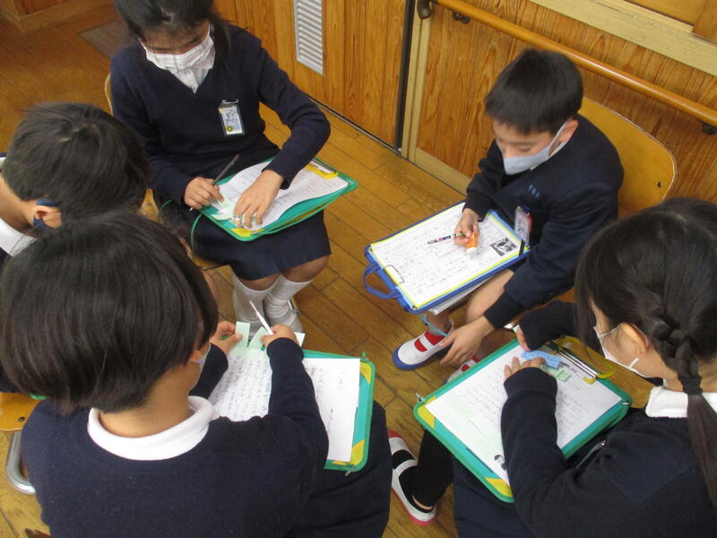 本校の4年生、三角小の4年生どちらも同じ活動に取り組み、本校から三角小へ出向いて、実際に書いた手紙を、班で交流し合いました。「どの手紙が登場人物の気持ちに近いだろうか」「自分の考えたことに近い手紙はどれだろうか」などの視点をもってお互いに読み合いました。