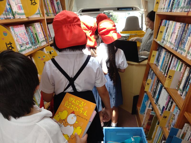 以前もお伝えしたことがありますが、宇城市の移動図書館「うきうき号」が月に2回ほどの割合で学校に来ています。宇城市立図書館の貸し出しカードを持っていれば、「うきうき号」が持ってきた本を借りることができます。本校は近くに公営の図書館はありませんので、こういった機会にどんどん本を借りて読む、という習慣を付けてほしいと思っています。ちなみに、司書の那須先生と「うきうき号」のスタッフの方にお話を伺ったところ、本校児童の利用率は高いそうです。また、自分で手にとって、自分で選ぶという行為自体が大切ですよね、というお話をスタッフの方としたところです。さて、「ほんどうかい」の中間結果の発表が木曜日の昼の放送で行われましたが、現在のところ赤組がリードしているようです。最終結果はどうなるでしょうか?お楽しみに。