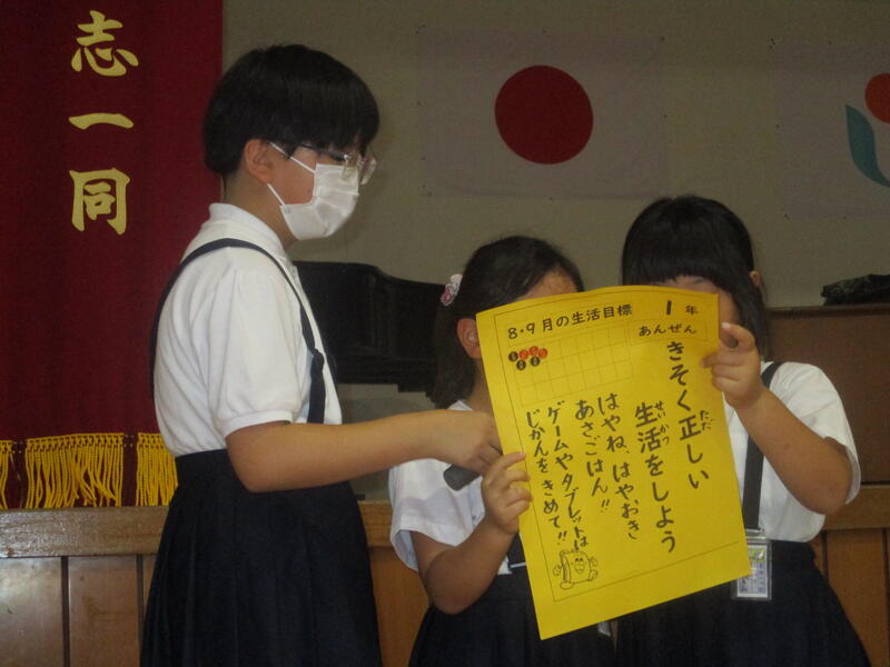 さて、今月の生活目標は「規則正しい生活をしよう」です。上記で述べたようなことや、「時間を意識して動こう」などの学級目標が出されました。また、企画運営委員会からは、「元気あいさつキャンペーン」についての説明がなされました。9月の委員会で「休み明けで、あいさつの元気がなくなっている」という意見が出たようで、それを受けて企画されました。期間は9月8日(月)~12日(金)の一週間。元気にあいさつができる青海小学校を目指そう、というめあてが出されました。また、今回は、司会から「夏休みの思い出についてお話ししてください」という投げかけが予告なしでありました。あまり挙手は多くありませんでしたが、数人の人が発表してくれました。一人一人、夏休みのすてきな体験をエネルギーにしてこれから頑張ってくれることと思います。