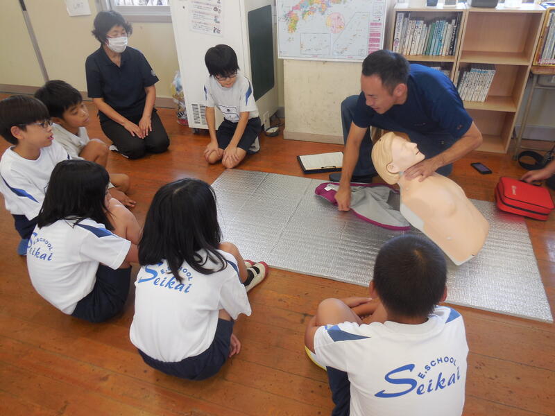 9月9日は「救急の日」です。救急業務及び救急医療に対する国民の正しい理解と認識を深める日とされています。本校の5年生が、まさにこの9月9日に、消防署の皆様から救急救命法の講義を受けました。保健に「けがの予防」という分野があり、子どもたちは班に分かれて貴重な指導を受けることができました。職員も水泳の授業開始前に毎年受けていますが、胸骨圧迫の方法を子供たちも学びました。昔は「心臓マッサージ」と言っていましたが、今は「胸骨圧迫」と言います。強く、早く、絶え間なく押す、という指示を受け、一生懸命取り組んでいました。小さい頃から、ぜひ体験しておいたほうがいい学びであると思いました。隊員の皆様、お忙しい中誠にありがとうございました。