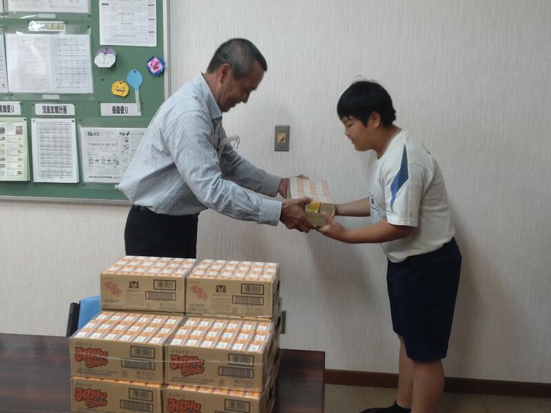 13日(火)に、JA熊本うき宇城柑橘部会(三角)の髙濱様がお見えになり、ジューシーを寄贈してくださいました。これからの暑い時期、子供たちは大好きなジューシーでのどを潤すことができて大喜びです。代表して、給食環境委員長さんが受け取ってくれました。私も小中学生の頃、もちろん飲んでいましたが、当時は三角パックでしたね(懐かしいです)。気になって調べてみますと、1973年5月から給食で提供されるようになったとのこと。そして!恥ずかしながら知らなかった事実が・・・。ジューシーは鹿児島でも給食に出されているのですね!ご存じでしたか?てっきり熊本県民だけが飲んでいると思っていました。もう一度、三角パックのジューシーを飲んでみたいです・・・。