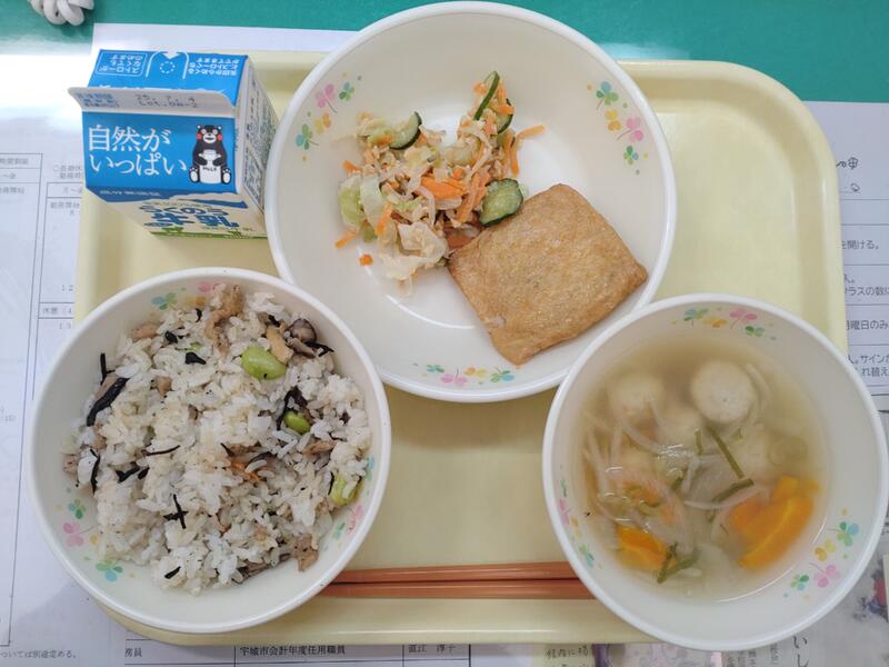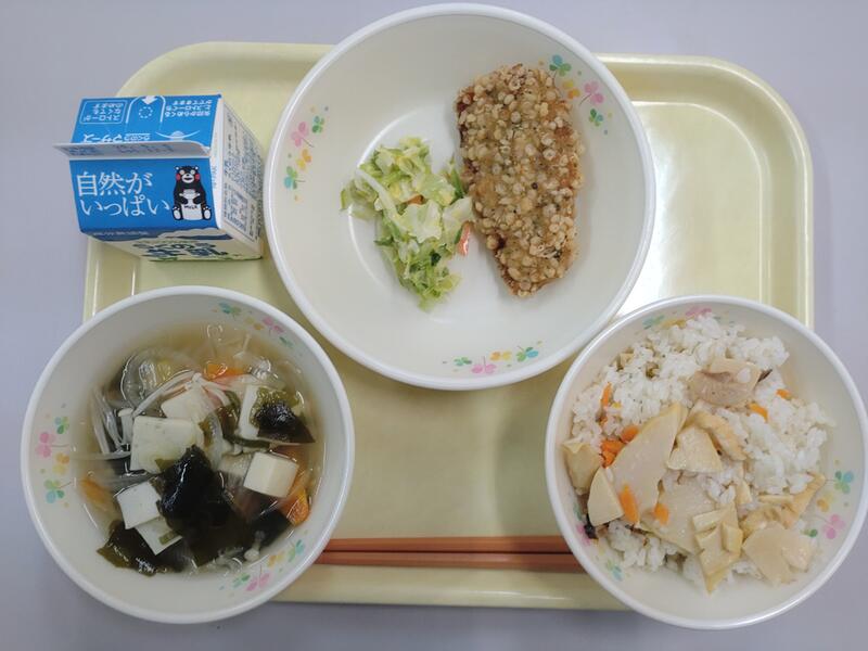 4月25日(金)の献立は、「たけのこご飯、すまし汁、ホキ(魚)の天玉揚げ、キャベツサラダ」でした。たけのこがとてもたくさん入っていて、幸せな気持ちになりました。野菜やタンパク質をしっかり摂って、元気になったように思います!ごちそうさまでした!