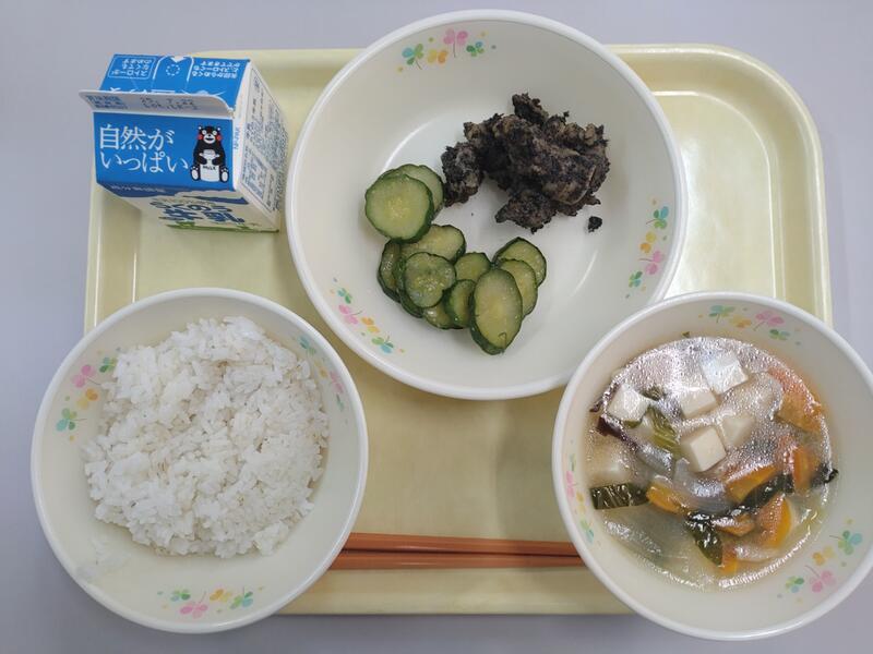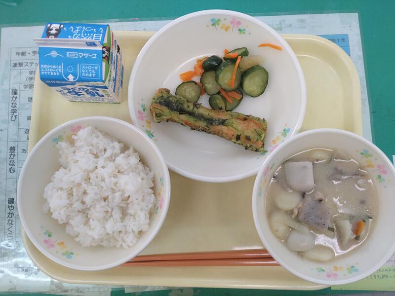 5月1日(木)の献立は、「味噌だご汁、ちくわのお茶揚げ、かりかりキュウリ」でした。味噌だご汁のだごはつるっとした食感でとてもおいしかったです。ちくわの揚げ物は、茶葉を使った色合いが美しかったです。今日もごちそうさまでした!
