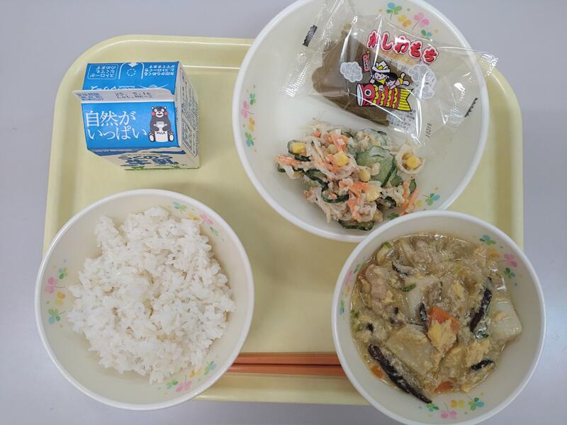 1日に引き続き、今日も行事食をいただきました。献立は「親子丼、切り干し大根とナッツのマヨ和え、柏餅」です。給食の親子丼はとてもおいしいですよ。切り干し大根を使ったサラダは、以前の勤務校でも出ていましたが、私の大好物です。給食の先生に作り方を教わって作ってみましたが、なかなか給食と同じようなおいしさにはなりません。