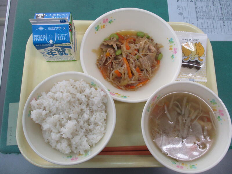 12月5日は「他県給食の日」ということで、北海道にまつわる献立をいただきました。献立は「豚丼、じゃがいも団子汁、一食黒糖ビーンズ」です。12月の献立表には、次のように記述されています。「北海道の十勝地方では、昔から豚を飼い養豚業がさかんで、豚肉がよく食べられていました。帯広市で『豚丼』が作られるようになりました。北海道のじゃがいもの収穫量は、国内の約8割を占めています。じゃがいも団子は、そのまま焼いたり、野菜と煮込んだ汁として古くから食べられてきたようです。」団子はつるんとして、とてもおいしかったです。