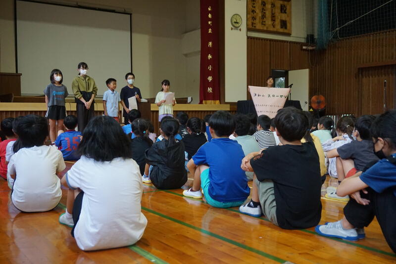 まずは、各学年の代表児童による発表です。1学期がんばったことや、夏休みに楽しみにしていること、2学期頑張りたいことなどの発表がありました。