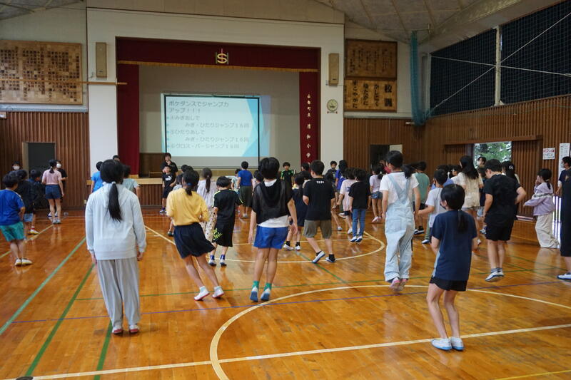 次は体育委員会の発表です。まずは、1学期に行ったスポーツテストの結果について報告があり、その後、みんなで曲に合わせて、楽しく体を動かしました。