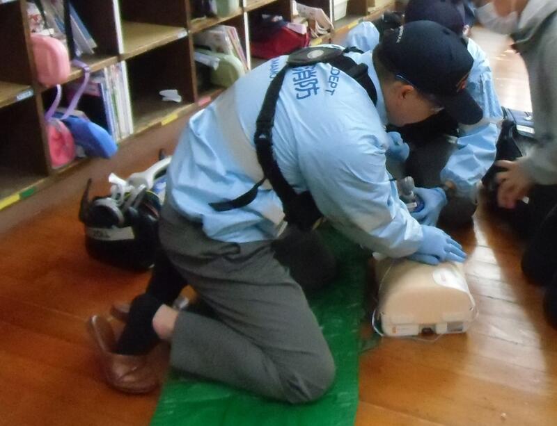 本校では年間で24回ほど、校内研修を行っています。授業研究をはじめ、人権教育、ICT実技研修などがあるのですが、今回は山都消防署の方々にご協力いただき、救急救命について研修を行いました。